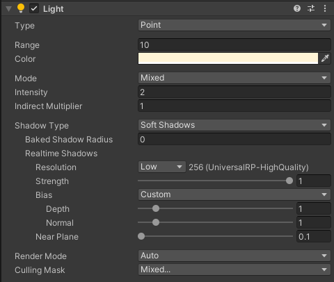| Bias| Controls whether to use shadow bias settings from the URP Asset, or whether to define custom shadow bias settings for this Light. Possible values are **Use Pipeline Settings** or **Custom**.|