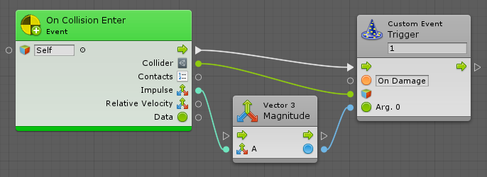 Note: The collider that hit with the boulder is the target of our trigger; the On Damage event is triggered on all machines attached to that collider. Use the damage value to subtract health from the receiver object.