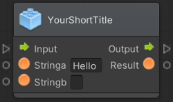 The example code below adds two input values of the type string and an output value of the type string. You can also add a default value: in the example below, the default string value of myValueA is set to “Hello”.