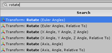 For example, the Rotate Transform unit has six overloads. Two of them take the angles as a single euler angle vector, two other take it as three separate float components in X / Y / Z, and the last two take it as an angle relative to the axis. In each pair, one specifies the relative space, while the other assumes that you're specifying angles in world space.