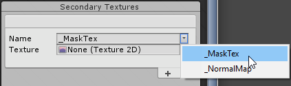 This adds a new entry to the list with the ‘Name’ and ‘Texture’ boxes. Enter a custom name into the Name box, or select the arrow to the right of the Name box to open the drop-down list of suggested names. These suggested names can include suggestions from installed Unity packages, as the Secondary Textures may need to have specific names to interact correctly with the Shaders in these packages to produce their effects.