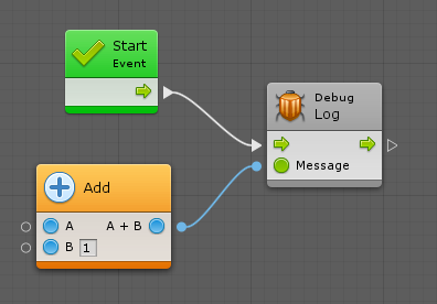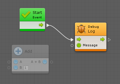 If you connect the result of A + B to Message, the Log node goes back to normal. However, the Add node turns orange, because it's missing its first operand, A.
