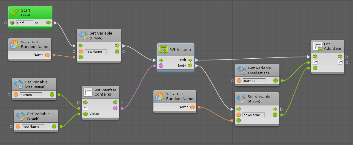For example, the following graph generates a new random name until the result isn't contained in the names application variable.