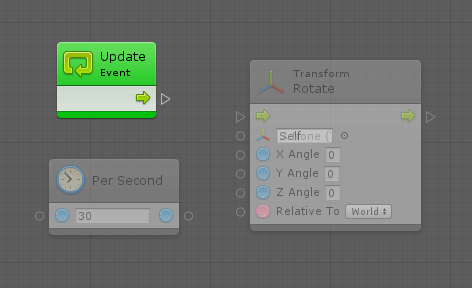 Example: This graph reads as "at every frame, rotate your own transform in the Y axis at a rate of 30 degrees per second".